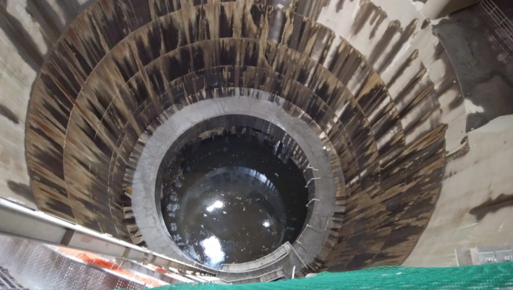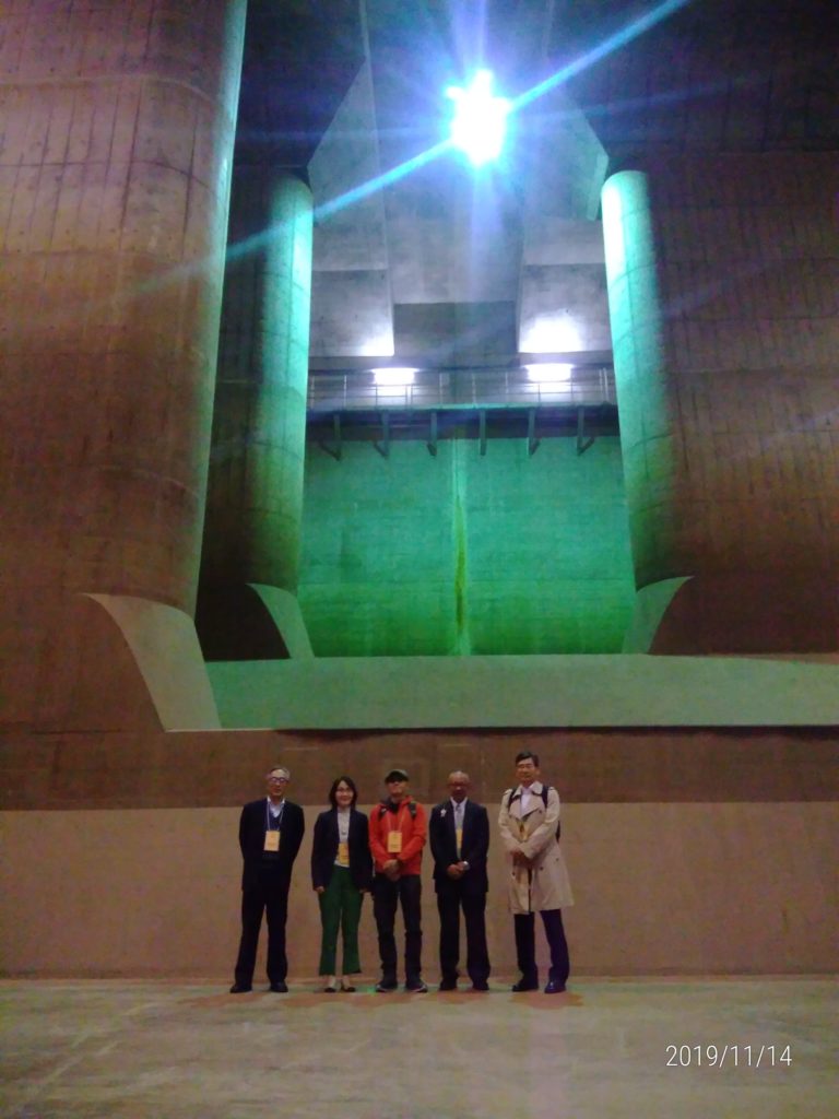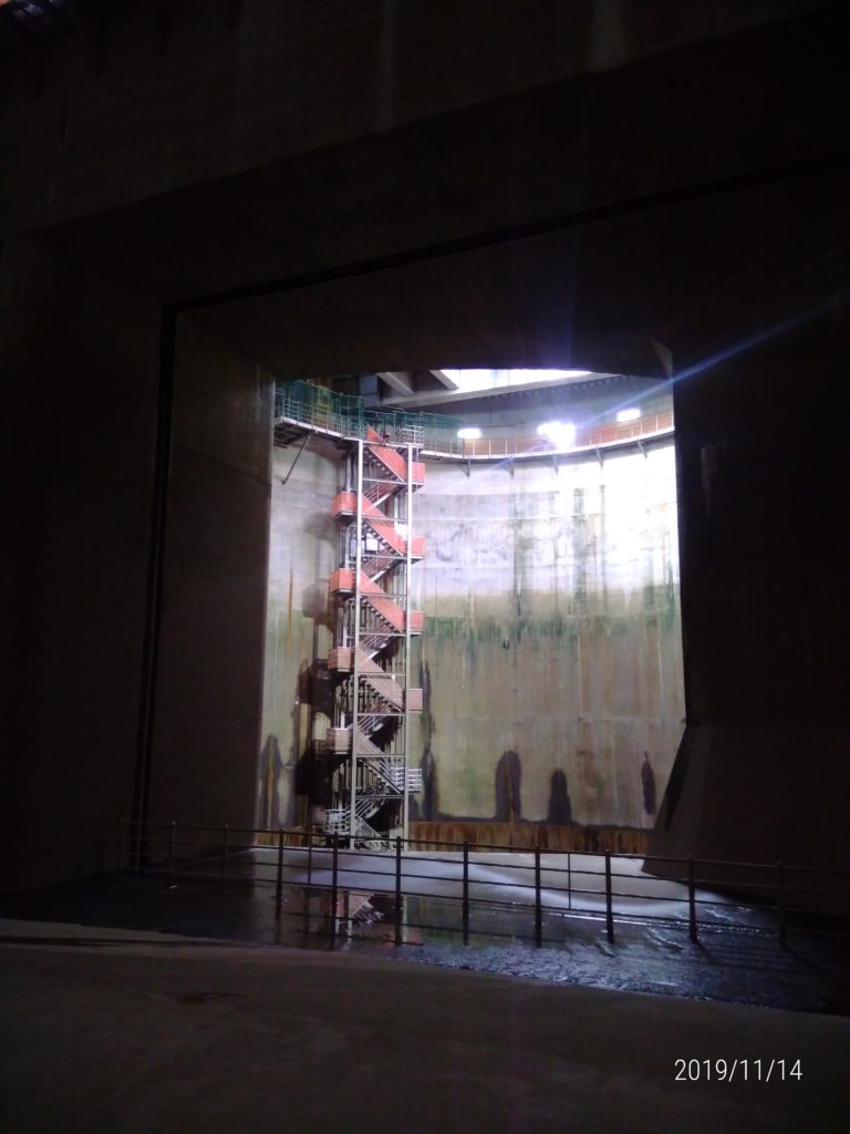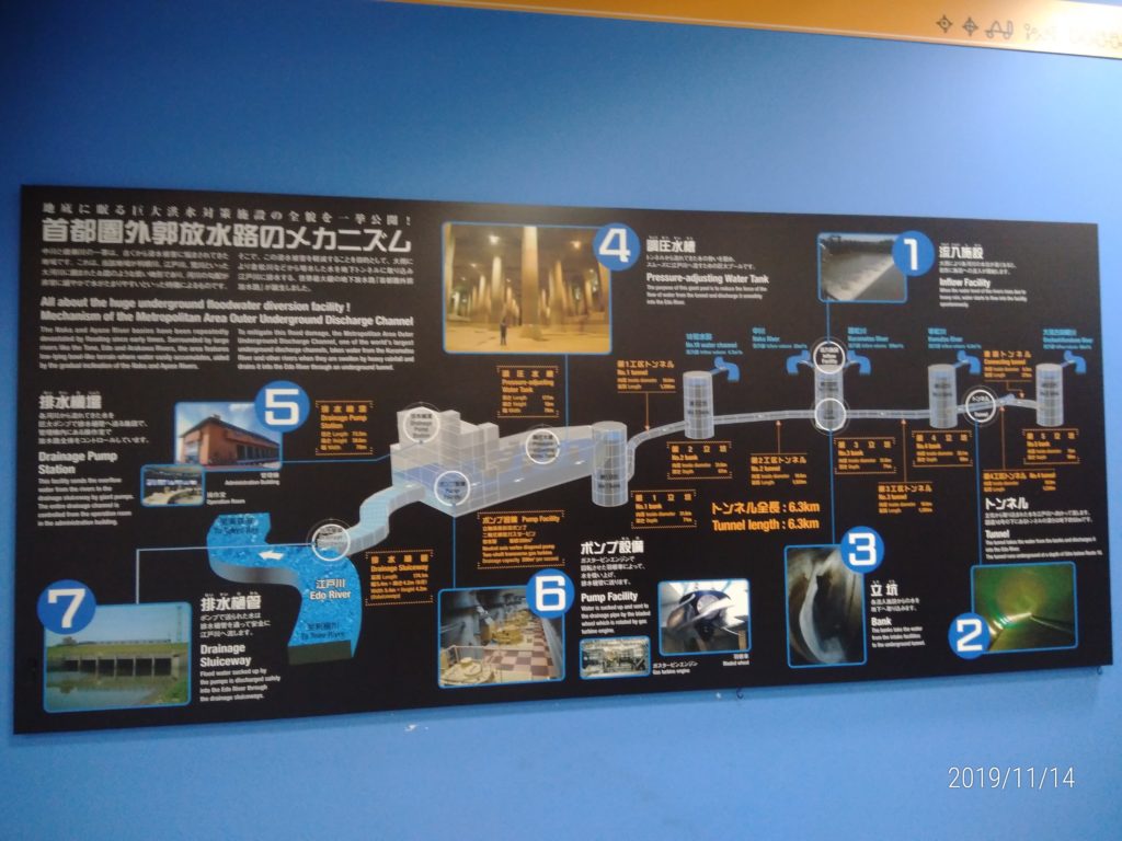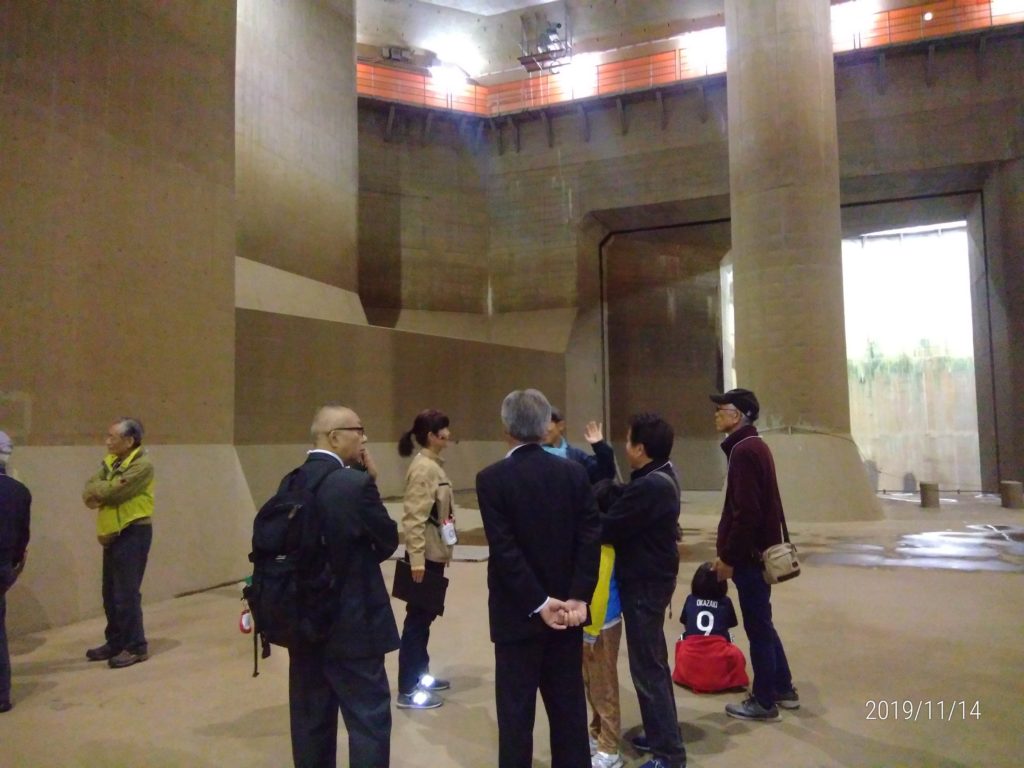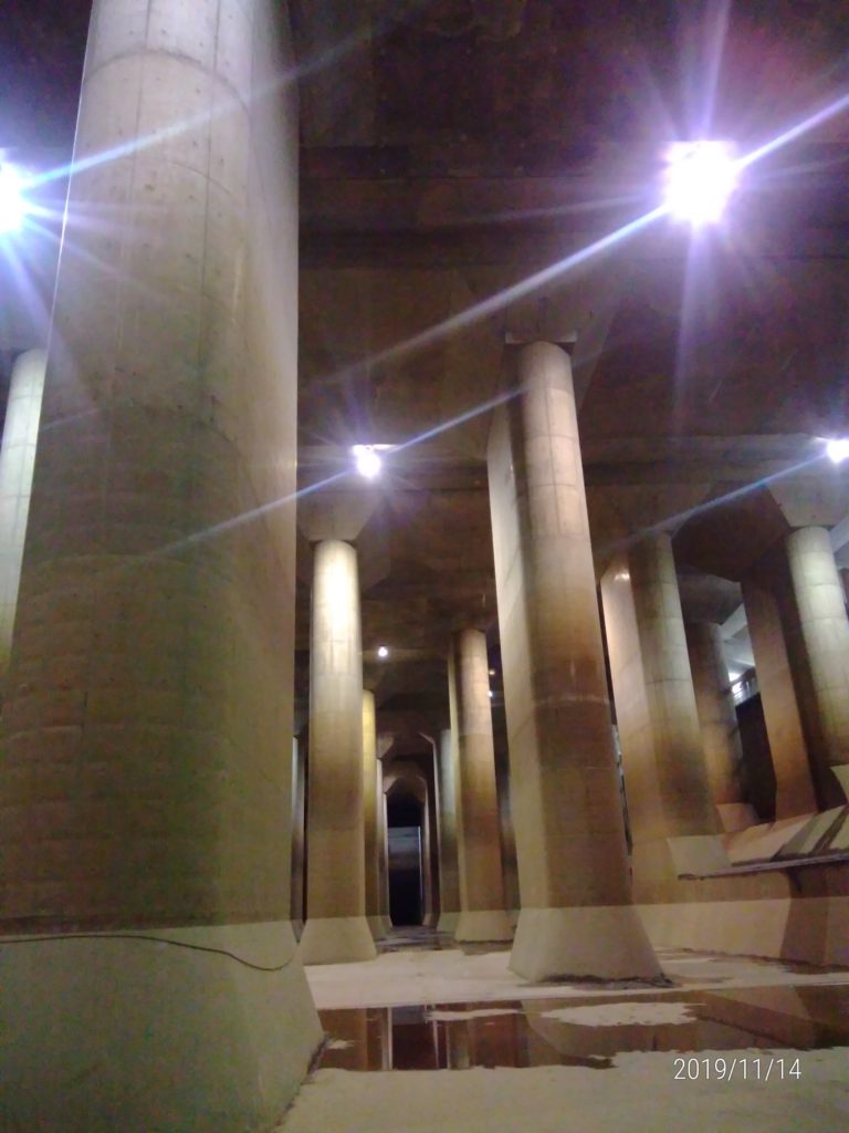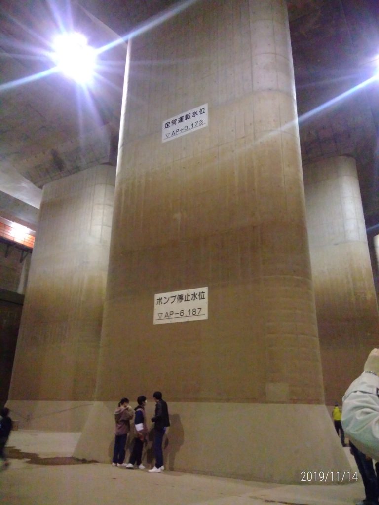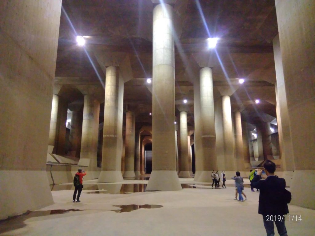 立杭が全部で5つあり、江戸川に放水する最後の部分を見学していますが、それぞれの杭は、深さ70メートル、内径30メートルあり、自由の女神がすっぽり入る大きさです。台風から河川の氾濫を防ぐ地下に作られたもうひとつの川。都市の災害を防いでいる重要な施設を見学しました。